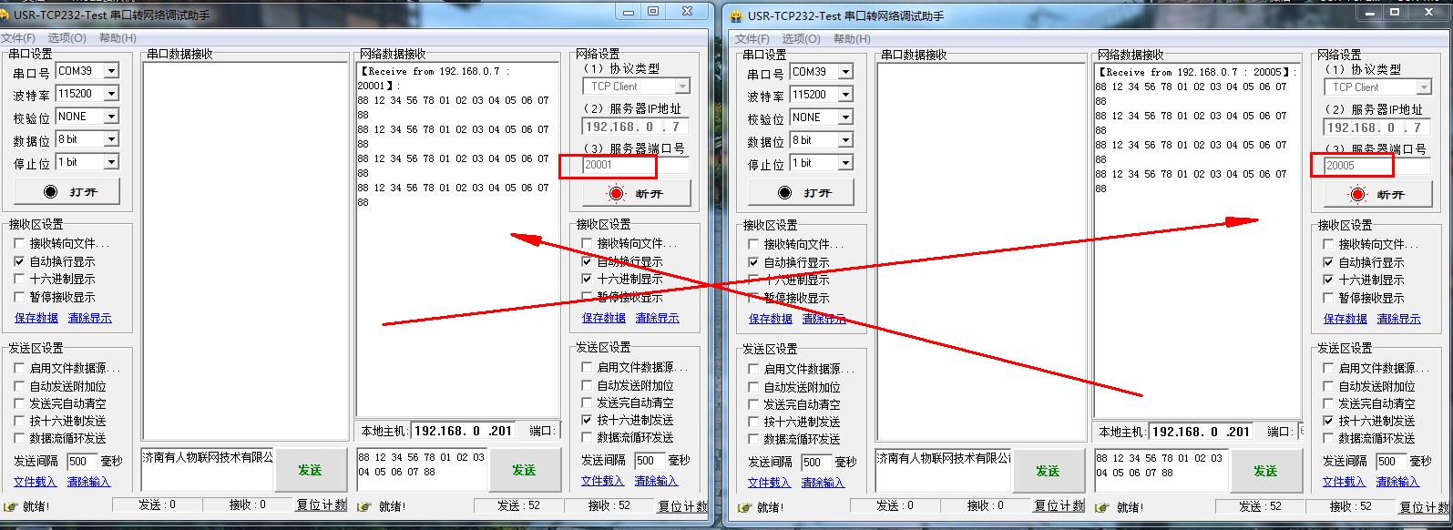在電腦下載,并安裝打開2個USR-TCP232-TEST 串口網(wǎng)絡助手。