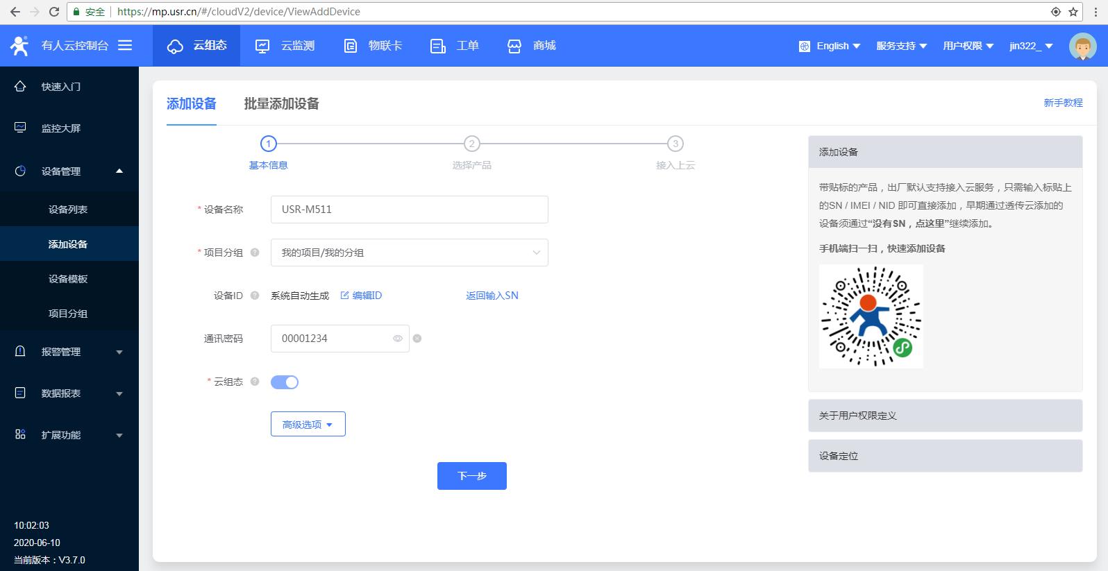 設(shè)備ID,填寫(xiě)有人云添加的USR-M511的設(shè)備ID