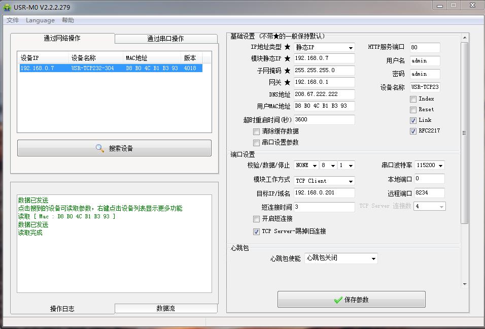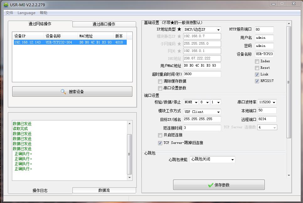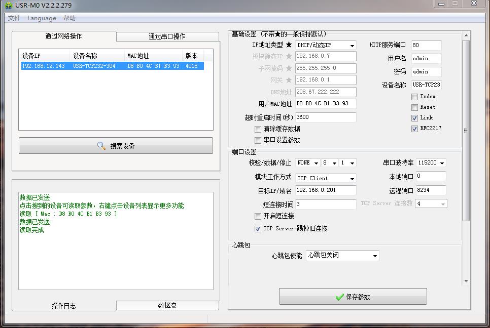 用M0設(shè)置軟件搜索USR-TCP232-304的IP,192.168.0.7,USR-TCP232-304用設(shè)置軟件將IP獲取方式從靜態(tài)改為DHCP,動(dòng)態(tài)獲取IP。