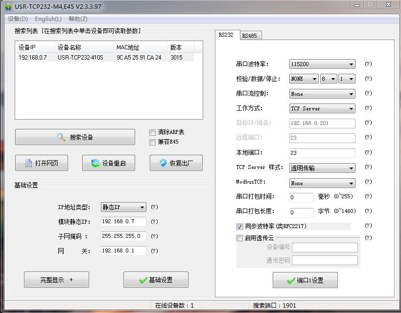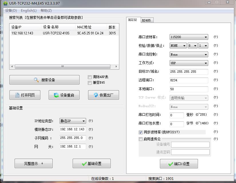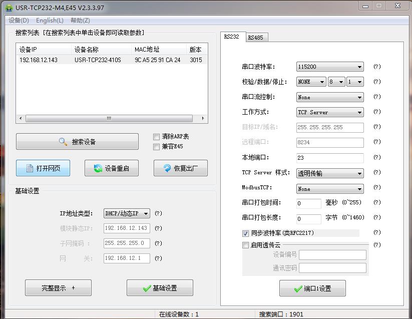 410S網(wǎng)口用網(wǎng)線接路由器,電腦也連接同一個(gè)路由器。用M4設(shè)置軟件搜索USR-TCP232-410S的IP 192.168.12.143