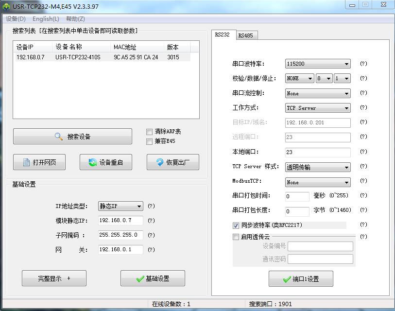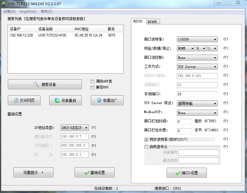 用M4設(shè)置軟件搜索USR-TCP232-410S的IP,192.168.0.7,USR-TCp232-410S用串口設(shè)置軟件設(shè)置DHCP,動(dòng)態(tài)獲取IP。