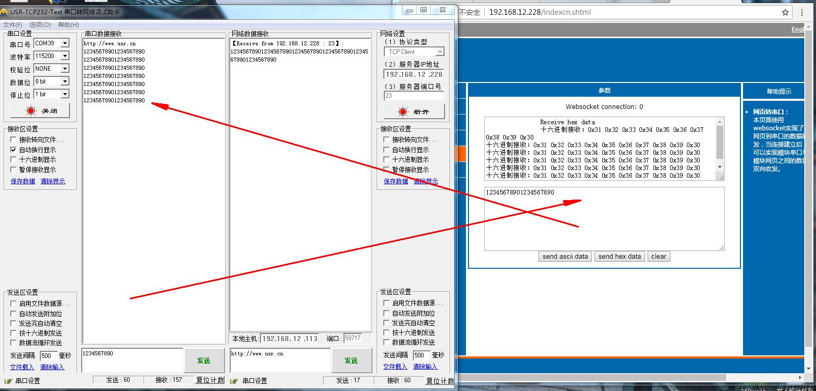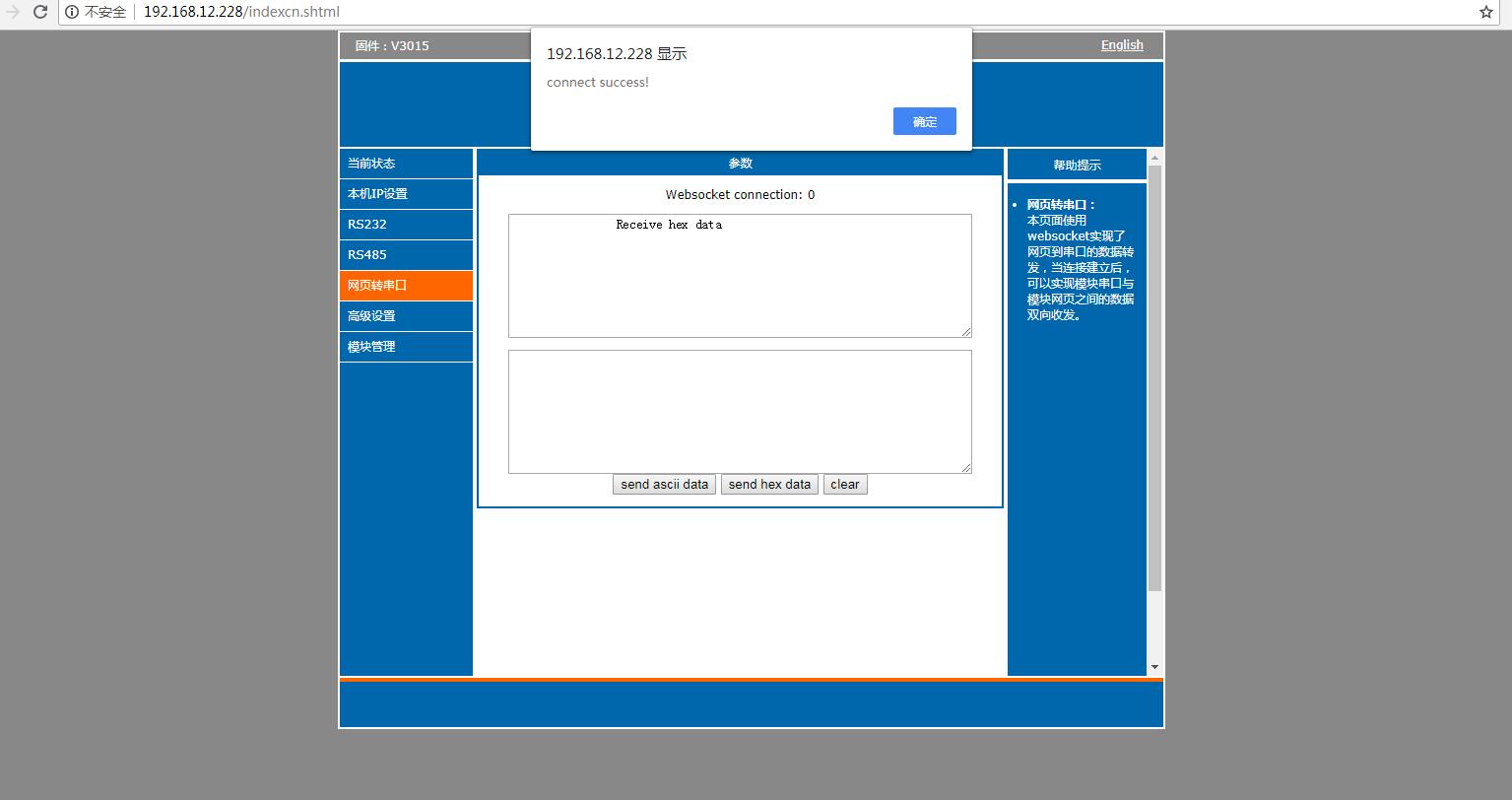 同時(shí)410S網(wǎng)頁打開websocket頁面,顯示連接成功,然后測(cè)試串口和websocket之間的數(shù)據(jù)傳輸。