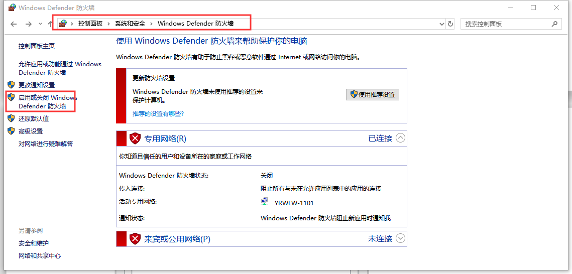 1. 按路徑:控制面板》網(wǎng)絡(luò)和Internet》網(wǎng)絡(luò)和共享中心找到“windows防火墻”和“更改適配器設(shè)置”選項(xiàng),關(guān)閉防火墻并禁用與本次測(cè)試無(wú)關(guān)的網(wǎng)卡。并關(guān)閉電腦殺毒軟件。