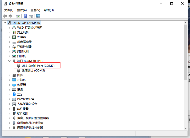 3. 在設(shè)備管理器中查看端口信息,確定E2串口使用的串口號(hào),如下圖所示電腦端口號(hào)為COM7,如果沒有看的COM口,下載一個(gè)驅(qū)動(dòng)精靈修復(fù)一下。