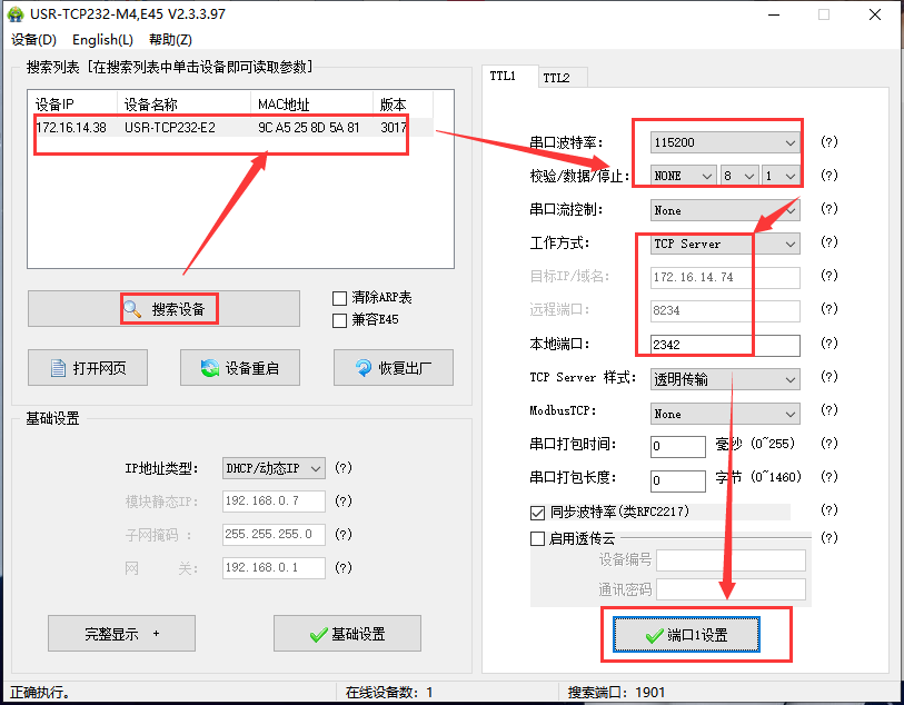 點(diǎn)擊“搜索設(shè)備”當(dāng)搜索列表中出現(xiàn)E2的設(shè)備后,單擊搜索到的設(shè)備,查看其配置信息,工作方式選擇TCp server,本地端口號(hào):2342,點(diǎn)擊端口設(shè)置保存參數(shù)。