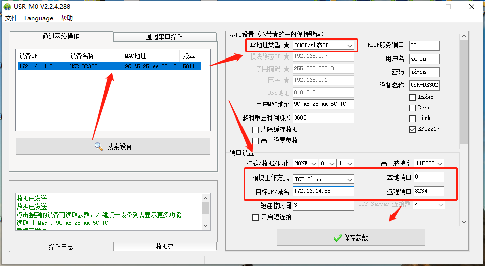 點(diǎn)擊“搜索設(shè)備”當(dāng)搜索列表中出現(xiàn)302的設(shè)備后,單擊搜索到的設(shè)備,右邊基礎(chǔ)設(shè)置,在“Ip地址類型”將靜態(tài)Ip改為DHCp動(dòng)態(tài)獲取,點(diǎn)擊保存參數(shù)。