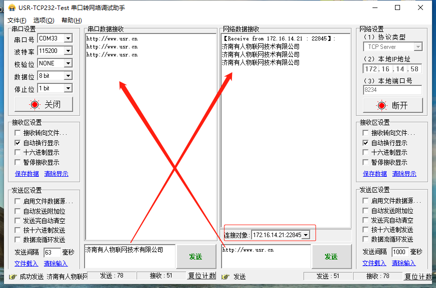 網(wǎng)絡(luò)端協(xié)議類型選擇TCp Server,本地Ip:172.16.14.58(此時(shí)路由器分配給pC的Ip),本地端口號(hào):8234(可設(shè))。具體數(shù)據(jù)測(cè)試如下: