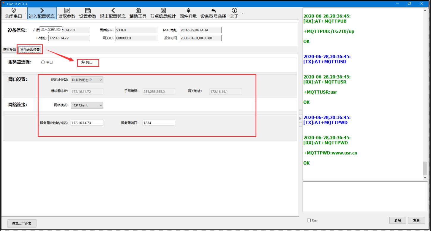 點擊“其他參數配置”,服務器選擇:“網口”。