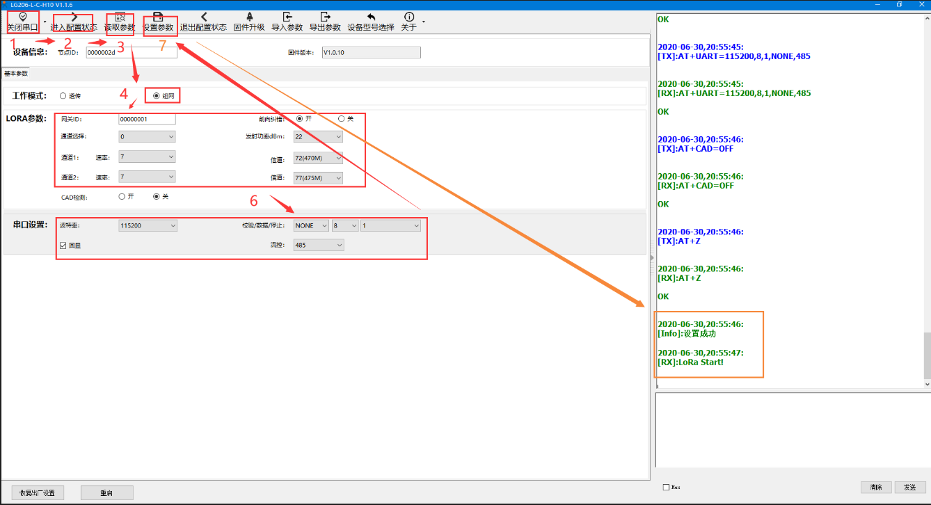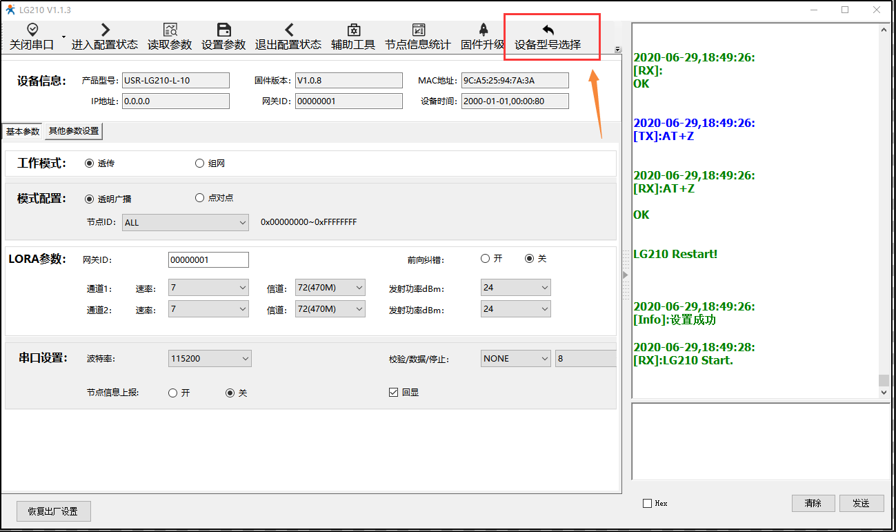 7) 配置LORA節(jié)點USR-LG206-L-C-H10,設置軟件設備選型選擇”LG206-L-p-H10”。