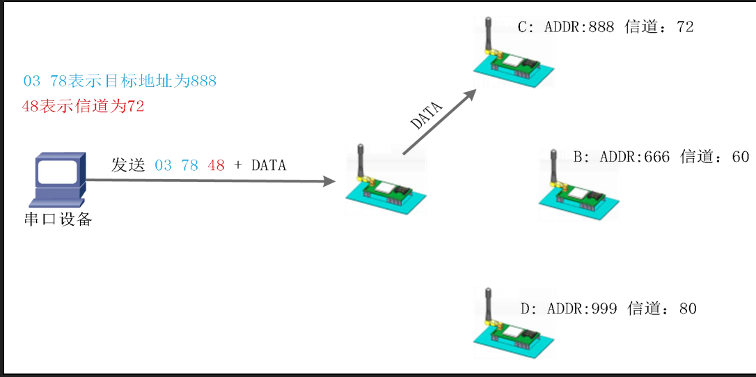當一臺設(shè)備 A(目標地址(ADDR):555,信道(CH):90)向另一臺設(shè)備 B(目標地址(ADDR): 888,信道(CH):72)發(fā)送數(shù)據(jù) DATA(123456),則只需要按照 16 進制發(fā)送(03 78 48 31 32 33 34 35 36)