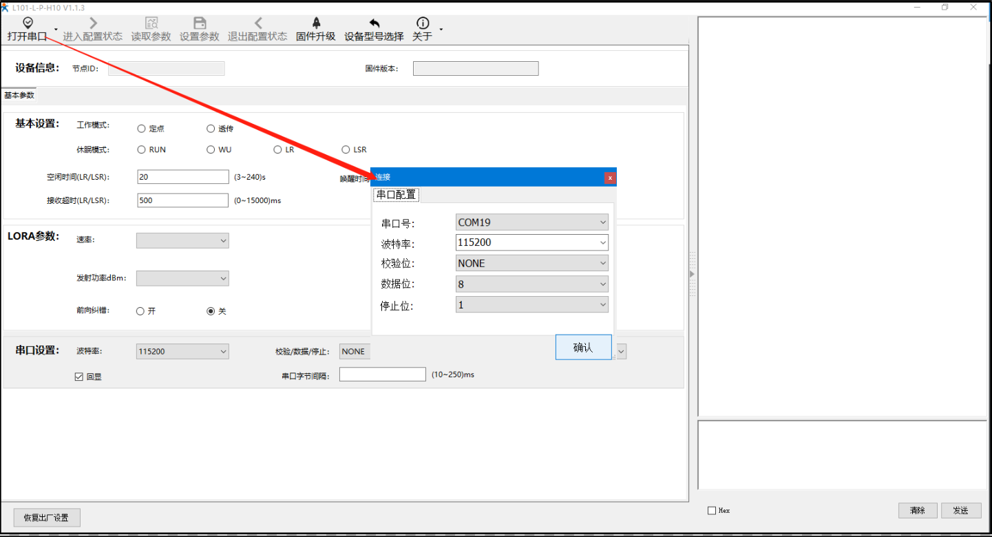 B、設(shè)置串口打開參數(shù),模塊默認串口參數(shù):115200,None,8,1,NFC。