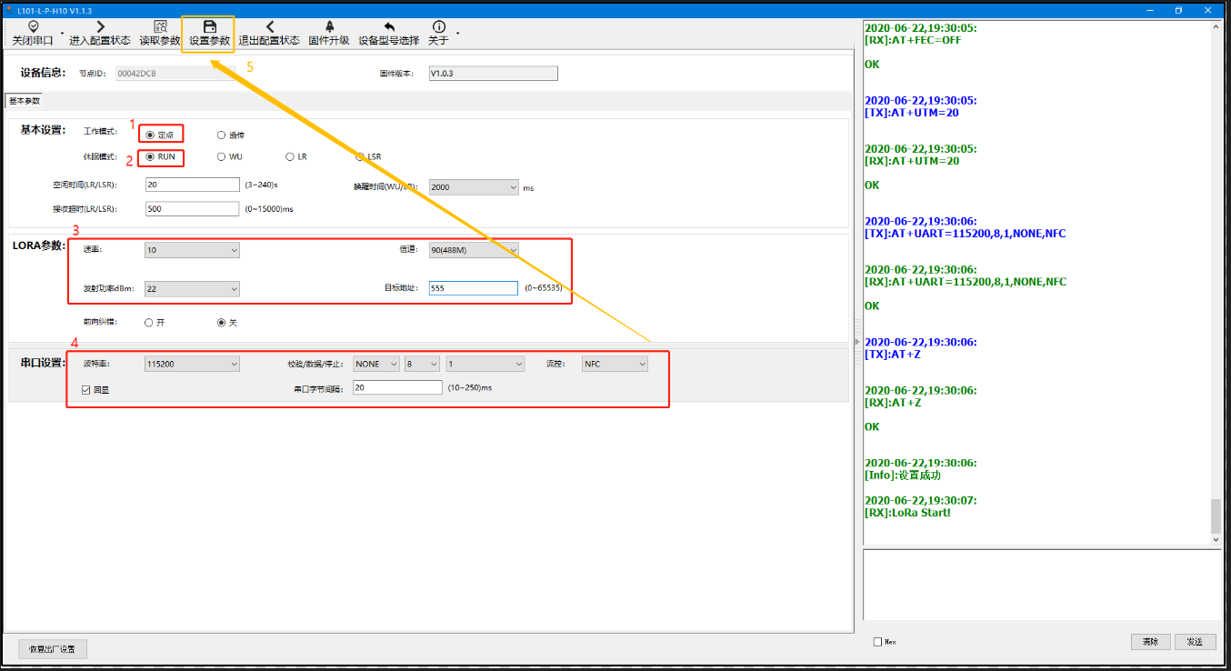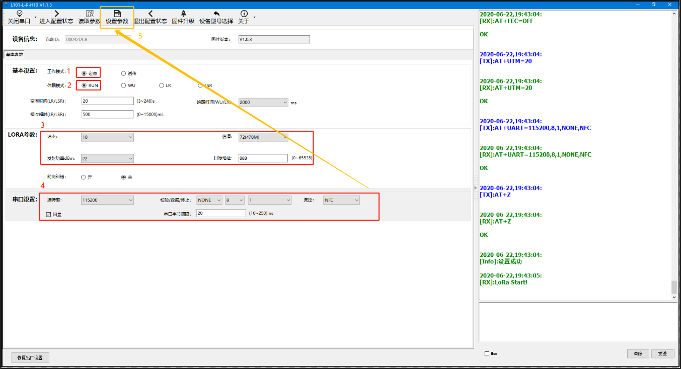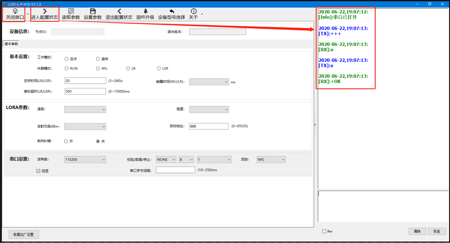 A、打開LoRa設(shè)置軟件(產(chǎn)品型號選擇為L101-L-p-H10),依次點擊打開串口(選擇A、B對應(yīng)的串口號,串口參數(shù):115200,None,8,1,NFC)、進入配置狀態(tài)、讀取參數(shù)、配置上表中的參數(shù)、一鍵設(shè)置所有參數(shù),關(guān)閉LoRa設(shè)置軟件。