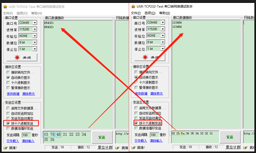 啟動兩個USR-TCp232-Test(模擬串口設(shè)備1,2)分別連接LoRa數(shù)傳終端A、B的串口,使用串口設(shè)備1發(fā)送數(shù)據(jù)串口設(shè)備2可接收數(shù)據(jù)(反之亦然).