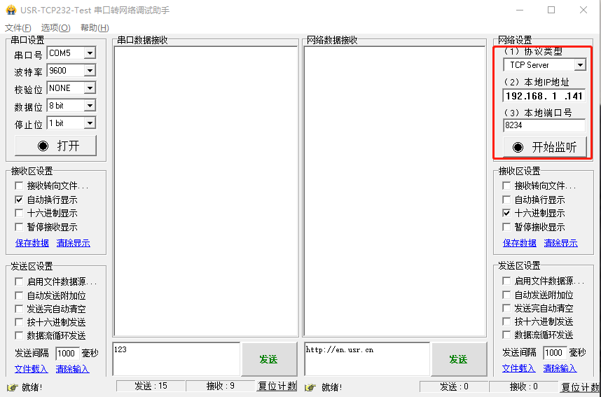 2、電腦打開(kāi)串口調(diào)試助手的網(wǎng)絡(luò)端,做TCp server。