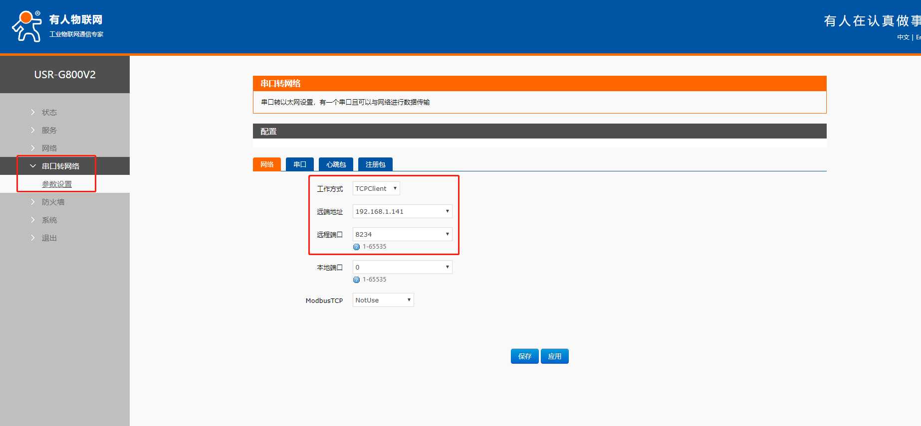 網(wǎng)絡(luò)設(shè)置為tcp clinet,地址設(shè)置剛剛串口助手的Ip和端口號(hào)。之后保存,應(yīng)用。