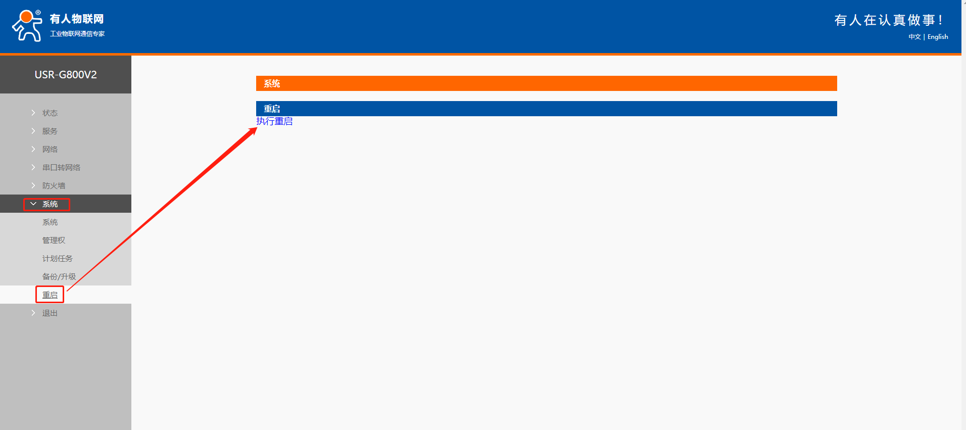 5、設(shè)置完成后,內(nèi)置網(wǎng)頁(yè)中選擇系統(tǒng)---重啟界面,執(zhí)行重啟。重啟后設(shè)置的參數(shù)才能生效。