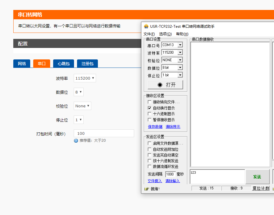 5、等到設(shè)備重啟完成,再次進(jìn)入內(nèi)置網(wǎng)頁(yè)看一下參數(shù)是否保存。串口調(diào)試助手打開(kāi)800V2相應(yīng)的串口,串口參數(shù)一致。