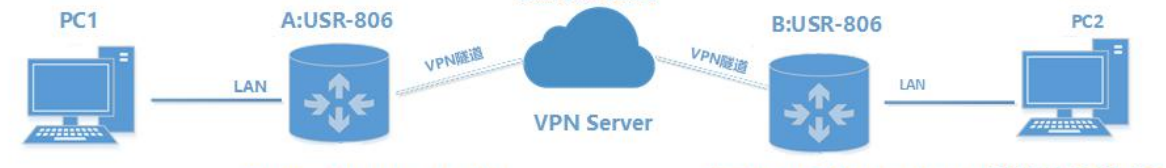 測試環(huán)境,兩個平級工業(yè)路由器 A 和 B,VPN 服務(wù)器, PC 兩臺,以 PPTP VPN 為例