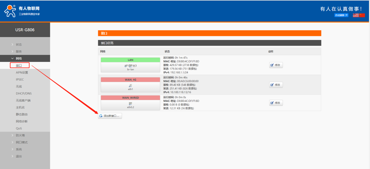 2、內(nèi)置網(wǎng)頁網(wǎng)絡(luò)--接口界面,新建一個接口名稱可自定義,協(xié)議選擇VPN服務(wù)器相應(yīng)的協(xié)議。比如要連接的VPN類型為PPTP,協(xié)議就選PPTP。