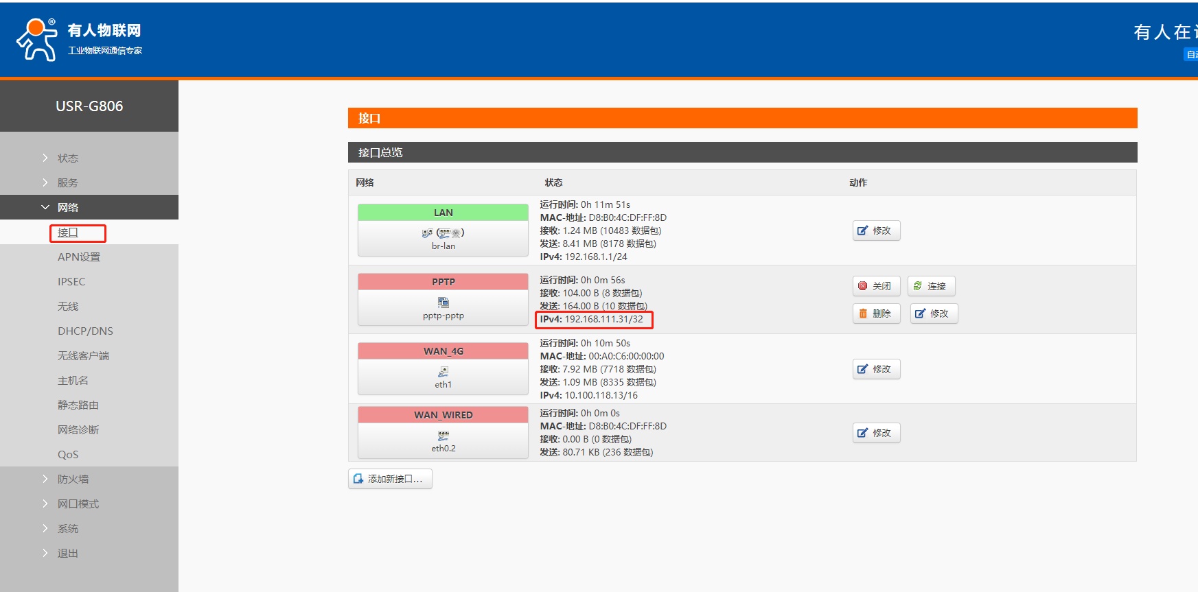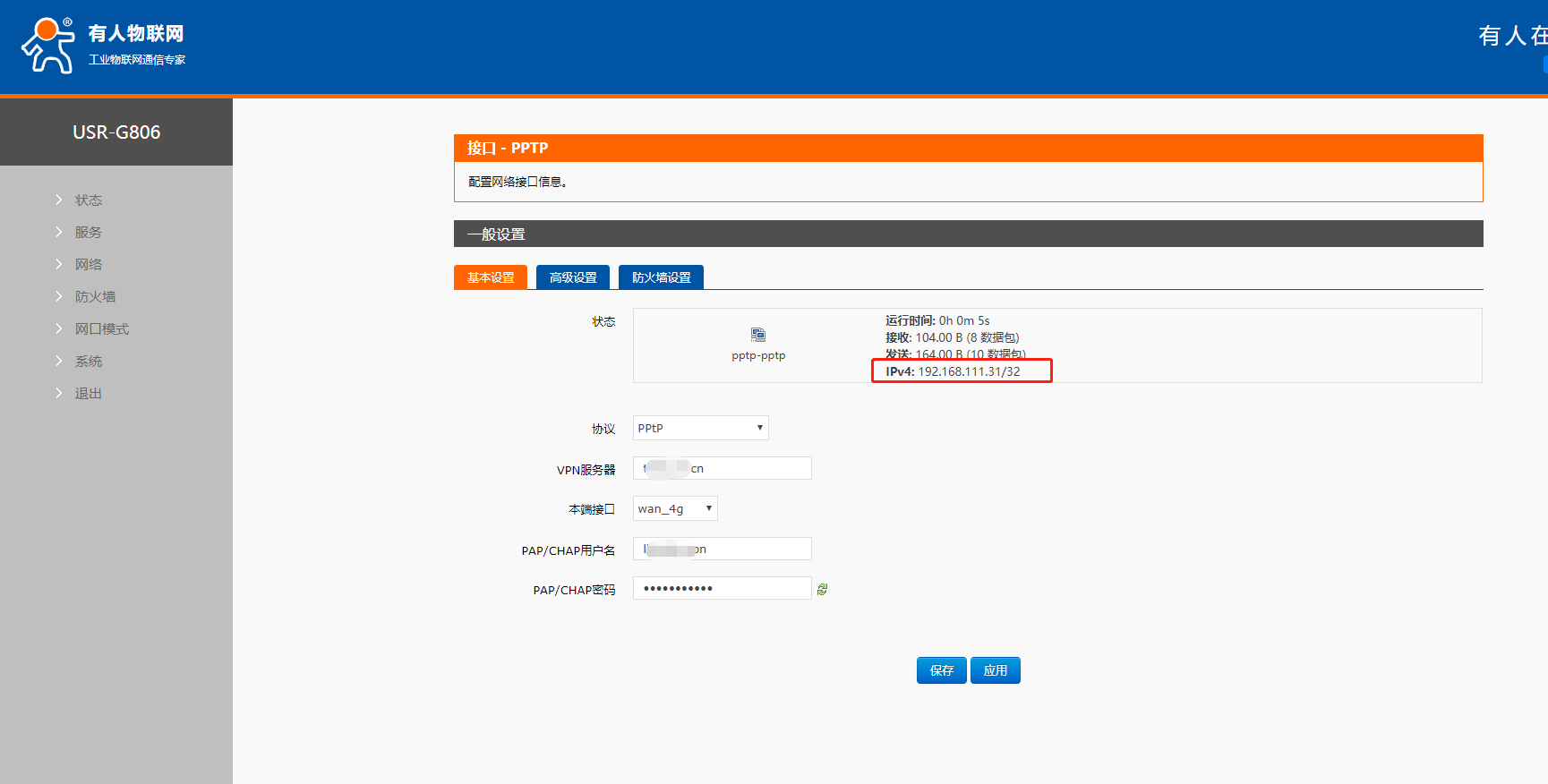 6. 設(shè)置參數(shù)無誤,保存應(yīng)用之后可以看到設(shè)備獲取到的VPN IP。在接口pptp位置可以看到,也可以進(jìn)入pptp這個接口查看。