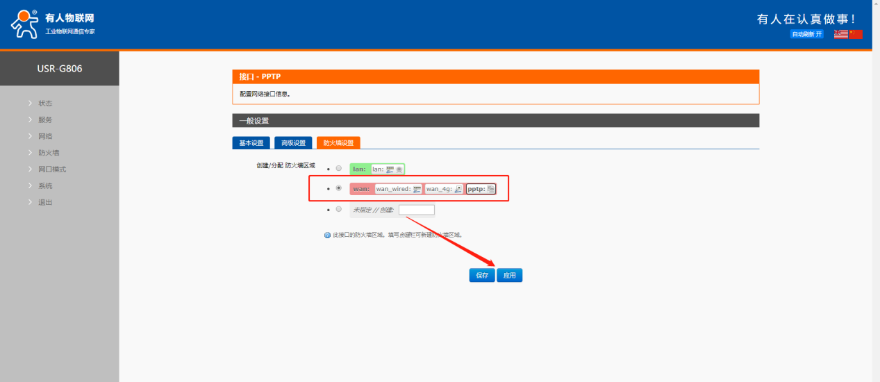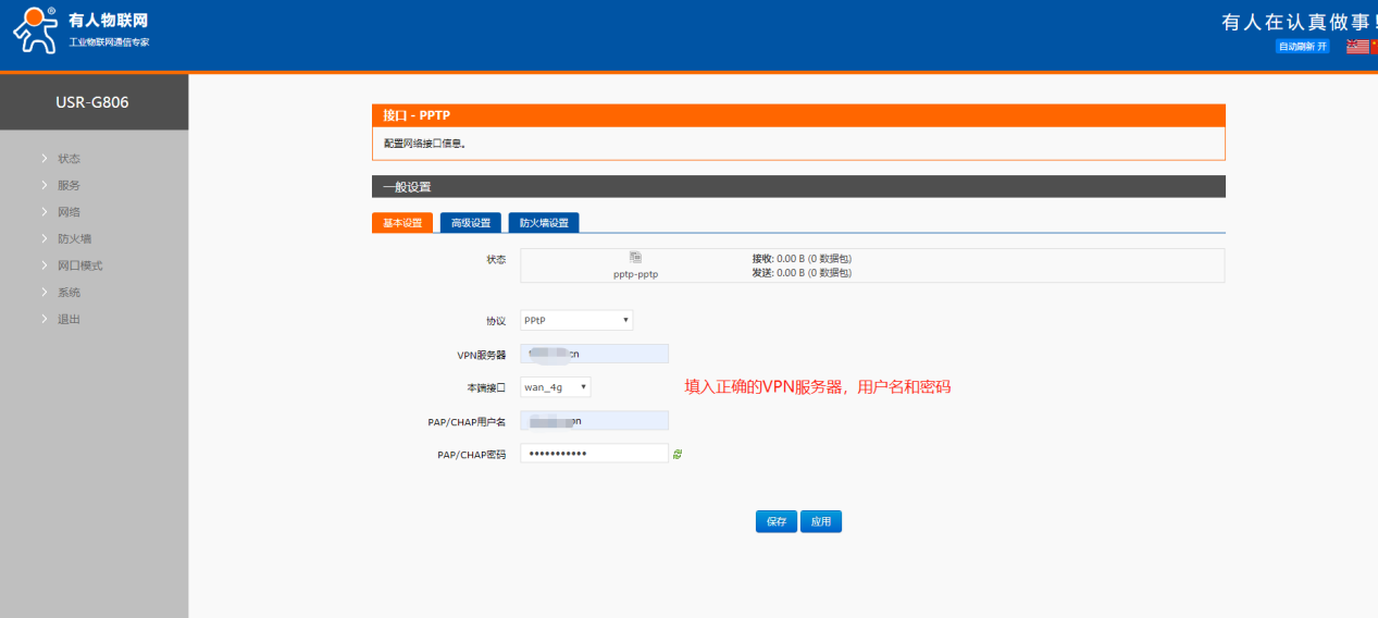 USR-G806:采用 4G 接口連接外網,創(chuàng)建 PPTP 接口連接 VPN;