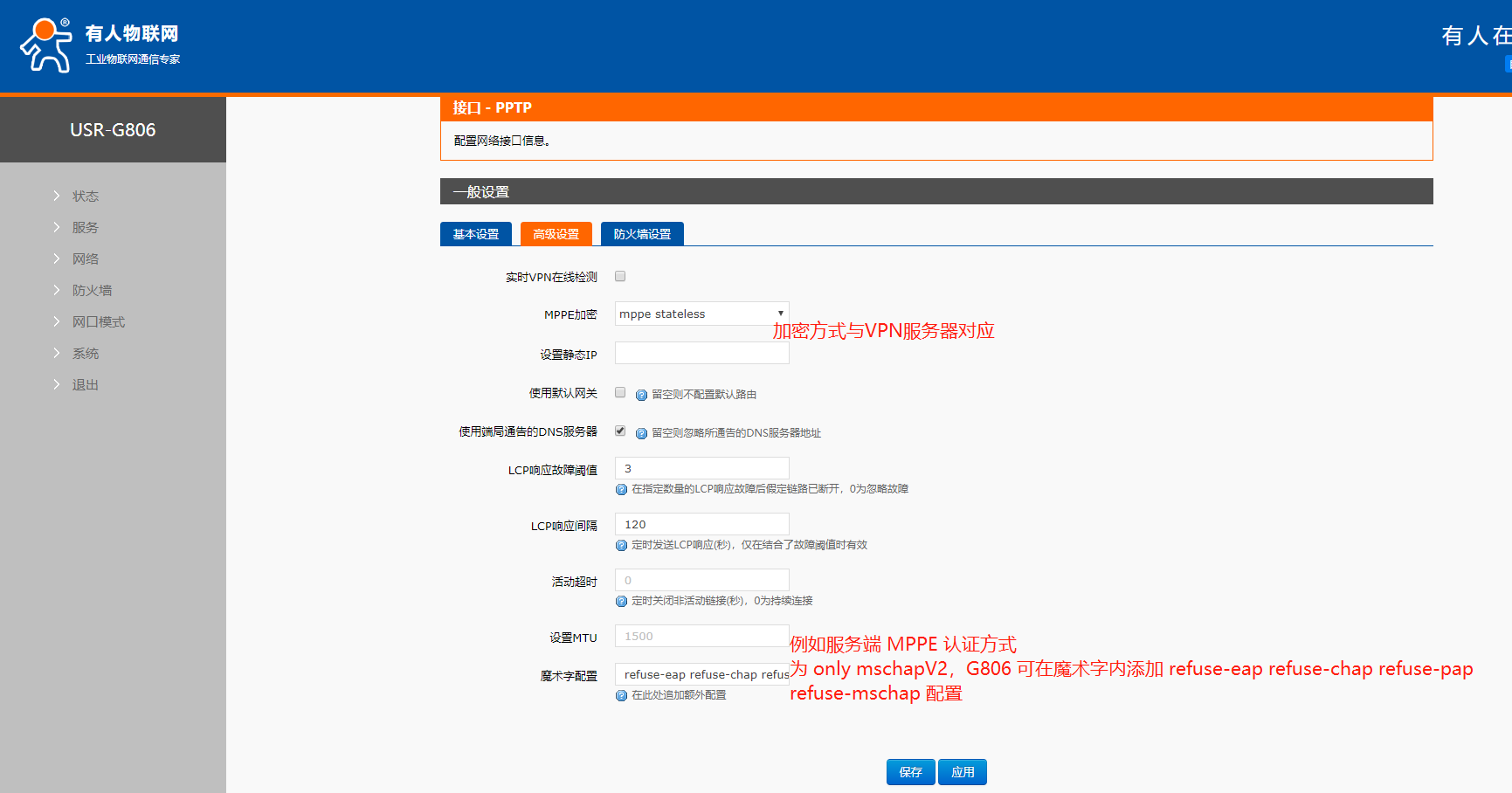 4、高級設置中加密方式與VPN服務器對應,其中加密方式可選:mppe stateful有狀態(tài)連接:會進行頻繁更換密鑰,且在更換密鑰時會出現(xiàn)嚴重丟包;mppe stateless無狀態(tài)連接:只有在丟包的時候會進行密鑰更改;no mppe服務端無 MPPE 加密方式時選擇此模式。魔術字:當以上配置不滿足配置文件和服務端向匹配時在此添加附加配置。例如服務端 MPPE 認證方式 為 only mschapV2,G806 可在魔術字內添加 refuse-eap refuse-chap refuse-pap refuse-mschap 配置