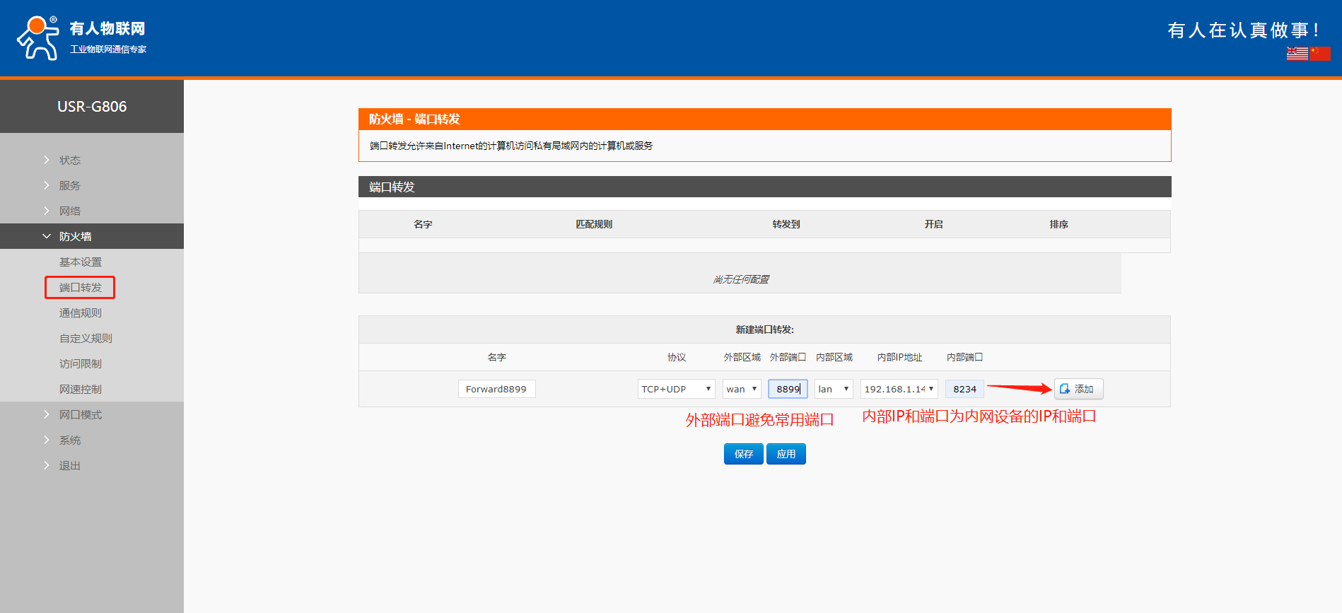 在內置網頁防火墻,端口轉發(fā)界面進行設置。內部IP和端口設置為內網設備的IP和端口,外部端口設置要避免常用端口。