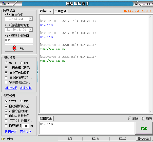 9、PC1即另一臺直接連上VPN的電腦,打開網絡調試助手,做tcp clinet端,IP設置806獲取到的VPN IP,端口設置為端口轉發(fā)的外部端口。能夠連接到 4G 路由器下的 TCP Server 并進行通信。
