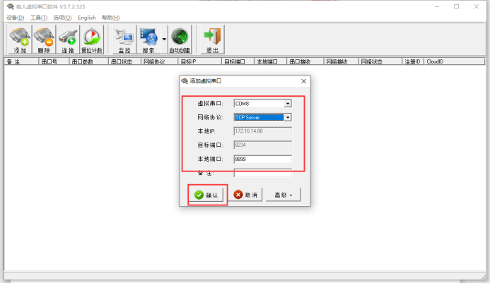 11.使用虛擬串口軟件建立TCP Server網(wǎng)絡(luò)監(jiān)聽(使用時(shí)需要將Test調(diào)試助手軟件創(chuàng)建的Server監(jiān)聽關(guān)閉,不能同時(shí)使用),且串口必須為未被占用的串口號。