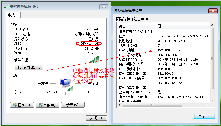 5:電腦連接WiFi模塊AP。可以獲取到路由器網(wǎng)段的IP。可以與路由器內(nèi)局域網(wǎng)電腦或者網(wǎng)絡(luò)設(shè)置通信。