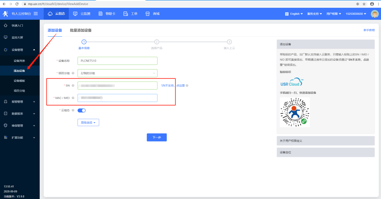 2.添加設(shè)備,使用PLCNET510背面標(biāo)簽的MAC和SN添加,點擊下一步