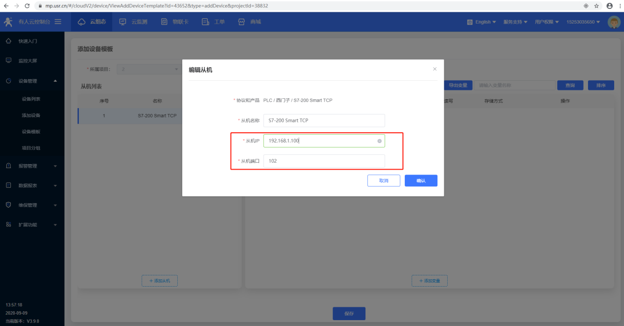 4.下一步填寫從機(jī)和變量,從機(jī)IP為PLC的IP,從機(jī)端口為PLC的端口