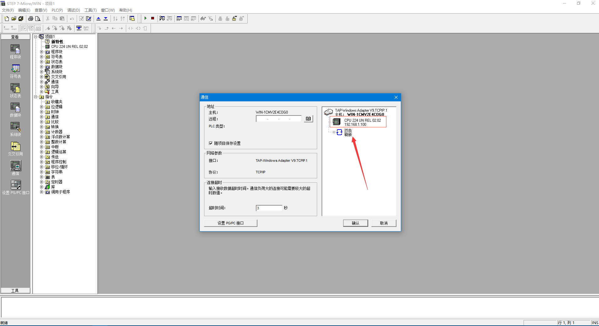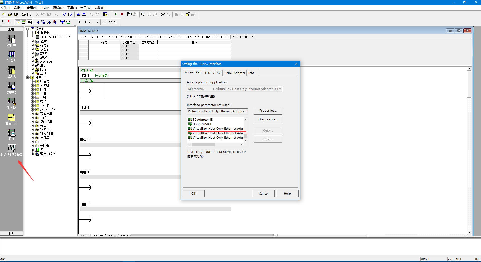 12.打開PLC100的上位機(jī)軟件,設(shè)置PG/PC接口,選擇虛擬網(wǎng)卡,點擊OK