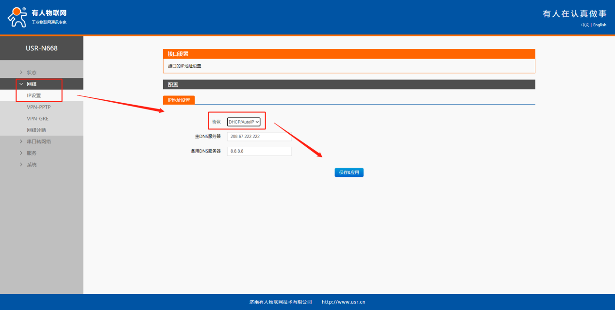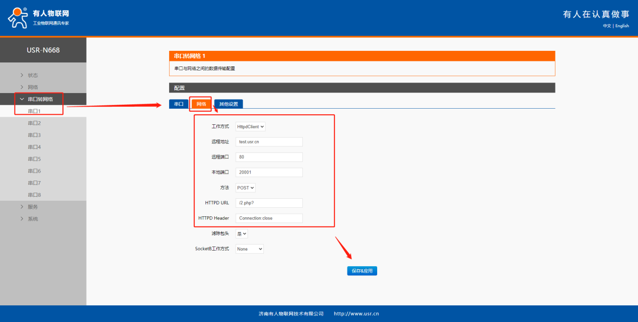 7、串口轉(zhuǎn)網(wǎng)絡(luò)確認工作方式為:HttpClient,設(shè)置服務(wù)器地址為:test.usr.cn,端口號:80(這個是我司測試服務(wù)器),設(shè)置請求類型為POST,報頭路徑為/2.php?,設(shè)置完成后點擊保存應(yīng)用。