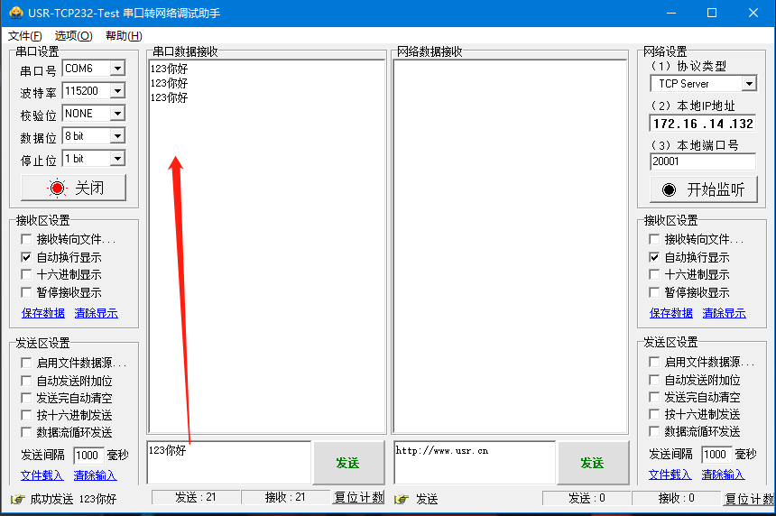 10、打開串口調(diào)試助手,打開正確的串口以及串口參數(shù),發(fā)送數(shù)據(jù)格式為:123你好,可以看到服務(wù)器返回的有效數(shù)據(jù)為123你好,具體測試截圖如下: