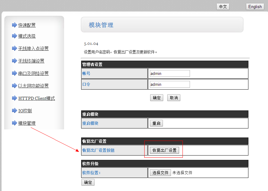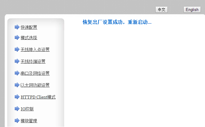 5:刷新頁面后顯示升級后的頁面,然后點(diǎn)擊“模塊管理” 的 "恢復(fù)出廠設(shè)置"