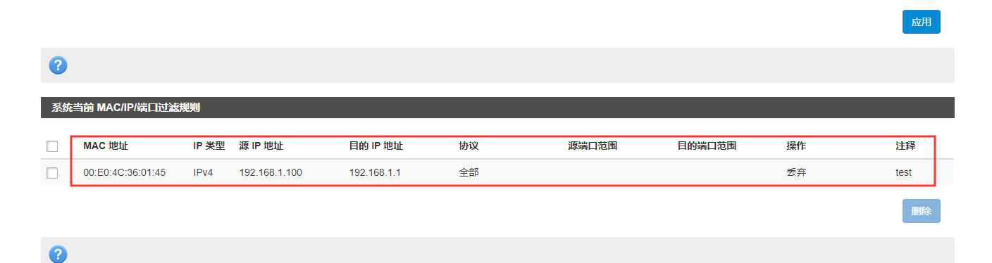 4. 在內(nèi)置網(wǎng)頁--防火墻中端口過濾界面進(jìn)行設(shè)置,啟用此功能之后點擊應(yīng)用。