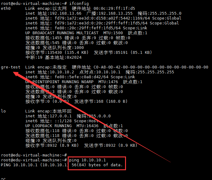 執(zhí)行完后,ifconfig看一下已經(jīng)出先一個gre-test網(wǎng)卡,但是這個ping 10.10.10.1是不通的