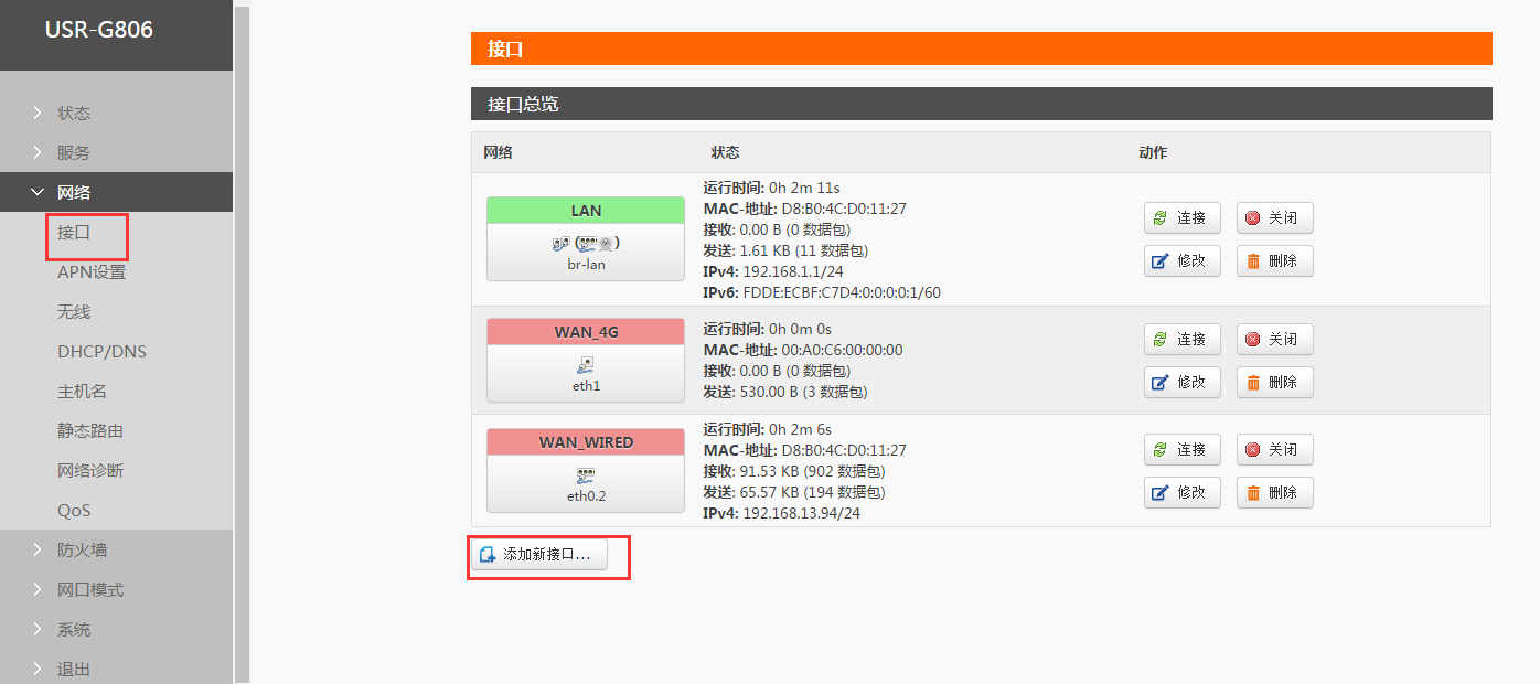 進入內(nèi)置網(wǎng)頁,點擊網(wǎng)絡(luò)--接口界面可以看到路由器現(xiàn)有的接口,這是三個接口不能隨意刪除,若不小心刪除可以將設(shè)備恢復出廠設(shè)置。