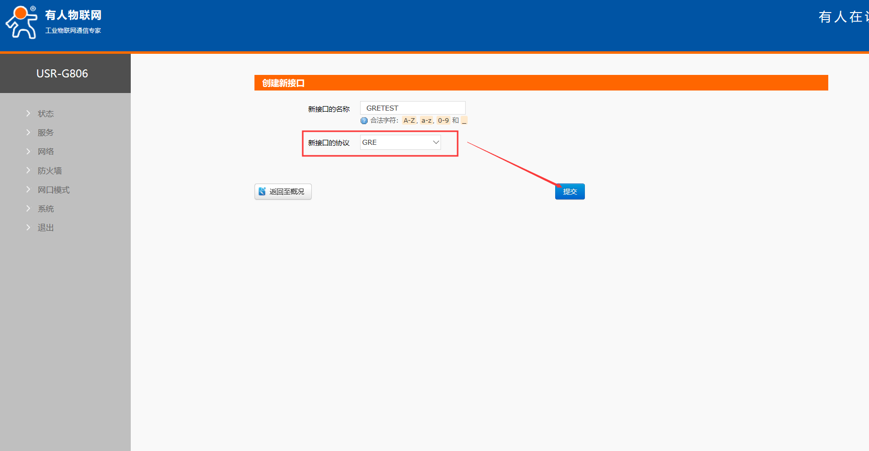 (3)選擇添加新接口,名稱可自定義,協(xié)議選則GRE,之后提交