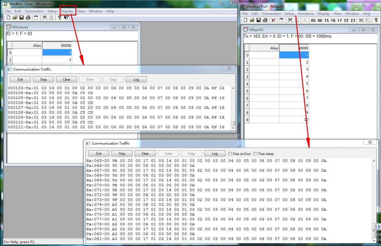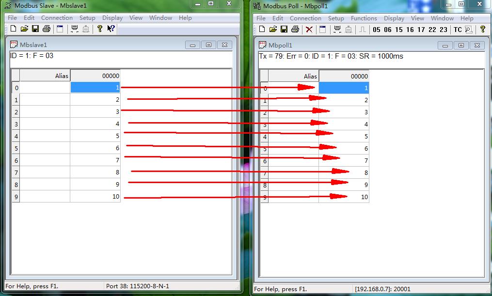 MODBUS SLAVE軟件改變從機(jī)ID 1 的寄存器地址0-9的內(nèi)部數(shù)據(jù),MODBUS POLL軟件對(duì)應(yīng)讀取從機(jī)寄存器數(shù)據(jù)。