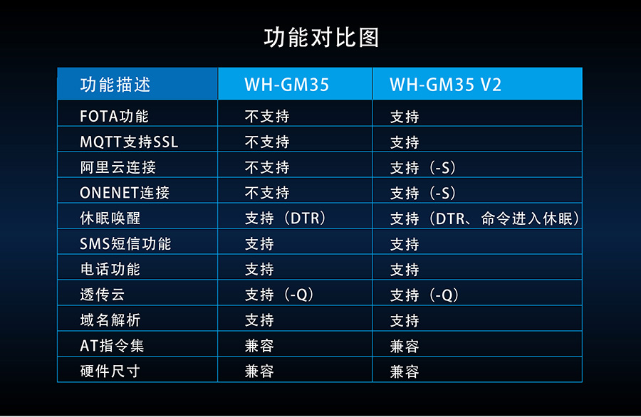WH-GM35 V2提供最基本的UART轉(zhuǎn)GPRS功能,低功耗,為用戶節(jié)省更多成本。此處同樣附上一張對(duì)比圖,方便小伙伴了解二者區(qū)別:
