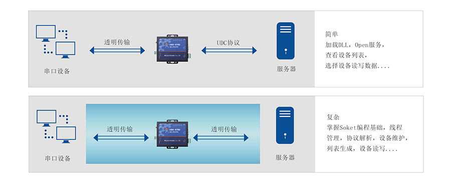 4G DTU在此工作模式下,網(wǎng)絡(luò)透?jìng)髂J缴显黾犹囟ǖ淖?cè)包和心跳包,并且對(duì)數(shù)據(jù)進(jìn)行組包。這種模式更方便用戶使用和二次開發(fā),用戶可以理解成加入 UDC 協(xié)議的網(wǎng)絡(luò)透?jìng)髂J?。此模式下,我們提供了服?wù)器端二次開發(fā)包,用戶在將鏈接庫加入到自己的工程后,就可以通過調(diào)用我們提供的接口,快速開發(fā)自己的服務(wù)端,好處在于設(shè)備的上線情況和數(shù)據(jù)傳輸既能被用戶所掌握,也可以由用戶來控制,既方便了用戶開發(fā),也提高了服務(wù)器端的統(tǒng)一性,穩(wěn)定性和可靠性。