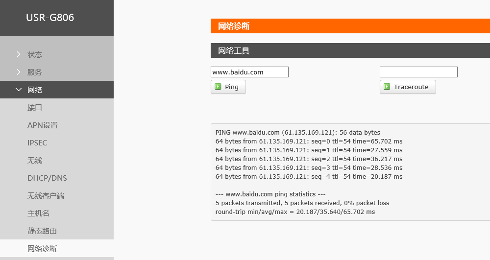最后,登錄工業(yè)4g路由器設(shè)置界面,進(jìn)行網(wǎng)絡(luò)診斷。以有人USR-G806為例,登錄192.168.1.1,輸入用戶名和密碼(默認(rèn)均為root)。點(diǎn)擊“網(wǎng)絡(luò)”——“網(wǎng)絡(luò)診斷”,輸入網(wǎng)址進(jìn)行ping測試。
