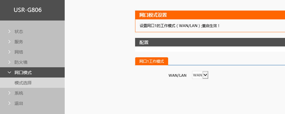 WAN+4G組網(wǎng)方式,也是WAN+LAN+4G組網(wǎng)。這種組網(wǎng)方式同時擁有有線和4G蜂窩聯(lián)網(wǎng)兩種連接到廣域網(wǎng)的方式,形成互補(bǔ),有效防止意外斷網(wǎng)的發(fā)生,保障證數(shù)據(jù)的完整、穩(wěn)定的傳輸。適合應(yīng)用在連接以太網(wǎng)方便、并且對數(shù)據(jù)傳輸穩(wěn)定性高的項目。設(shè)置方法是將網(wǎng)線連接好后,在設(shè)置界面,點(diǎn)擊“網(wǎng)口模式”——“模式選擇”,將網(wǎng)口1工作模式設(shè)置為“WAN”口即可。