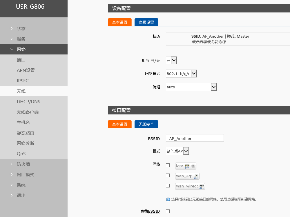 AP接口默認(rèn)是開啟的,需要進(jìn)入到AP接口設(shè)置界面進(jìn)行設(shè)置,如下圖: