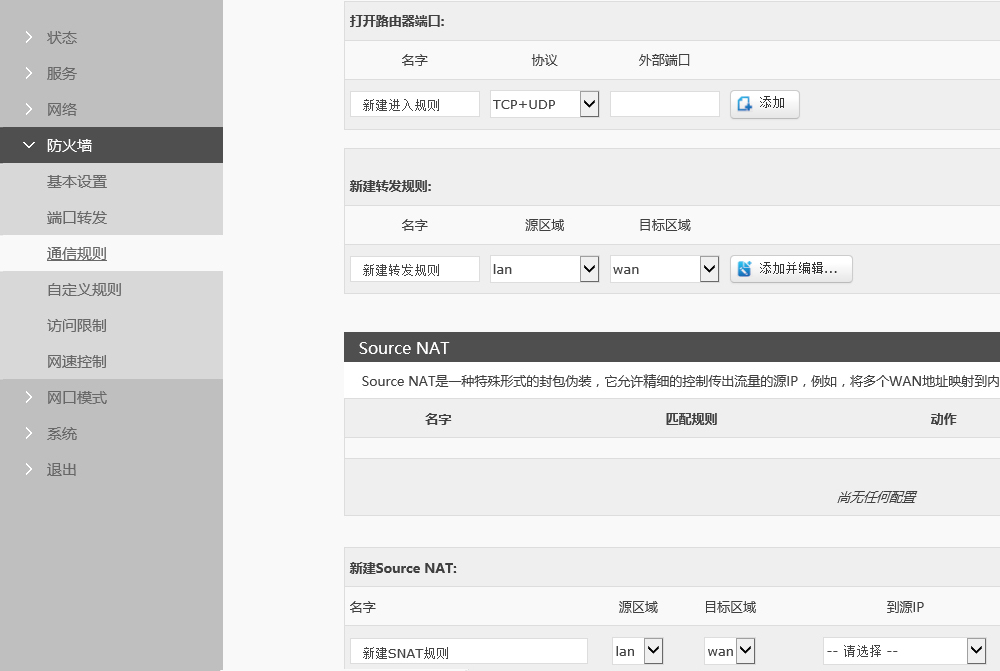 通信規(guī)則可以用來打開一些路由器端口,比如需要遠(yuǎn)程訪問路由器的配置頁面,可以打開80端口,遠(yuǎn)程ssh連接, 可以打開22端口。