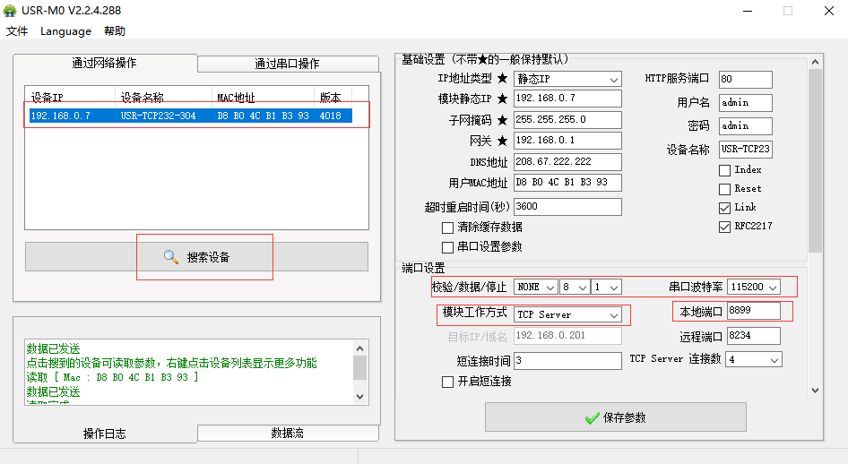 打開串口服務(wù)器的設(shè)置軟件,搜索設(shè)備,搜索設(shè)備成功后,設(shè)置該串口服務(wù)器的靜態(tài)IP地址、波特率,本地端口以及工作方式。如果將串口服務(wù)器進(jìn)行一對一傳輸,需要將這款串口服務(wù)器設(shè)置為TCP Serever的工作模式,點(diǎn)擊“保存參數(shù)”(很多人忘了最簡單也是最重要的這步)。