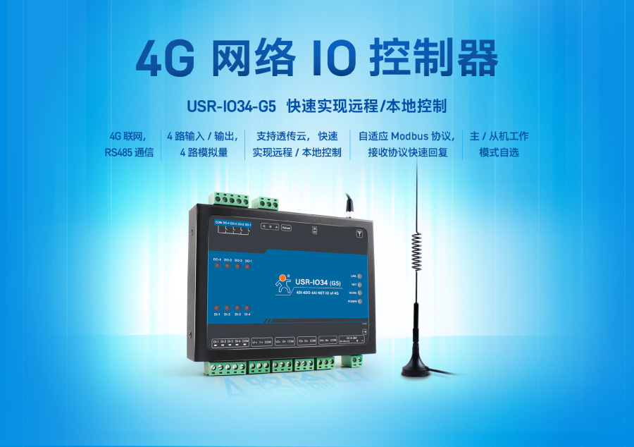 下面以4G網(wǎng)絡(luò)IO控制器USR-IO34-G5為例,向大家介紹產(chǎn)品功能和特點(diǎn)。