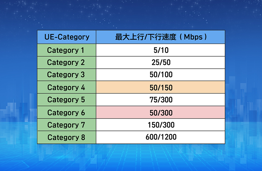 Cat就是UE-Category,UE是用戶設(shè)備(User Equipment),Category是分類,而Cat-X的值被用來衡量用戶終端設(shè)備的無線性能,通俗講,就是用來劃分終端速率(等級)的。